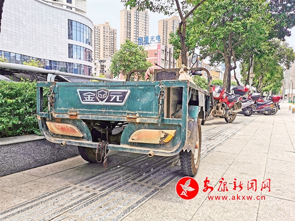 ?6月22日,安康城區江北江華公司消防通道被摩托車占用(圖1),這一區域的人行道盲道也被各種車輛侵占(圖2),存在安全隱患。(記者 潘潤生 攝)
