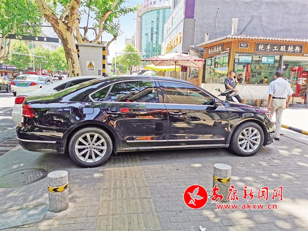 6月30日,在漢濱區鼓樓街興安中路十字,汽車、摩托車占用人行道,給行人帶來不便。(記者 潘潤生 攝)