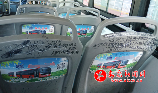 7月7日,筆者乘坐安康市城區7路公交車發現,公交座椅靠背慘遭“涂鴉”,內容不乏廣告標語、低俗粗鄙、不堪入目的語言,嚴重影響乘車心情。希望廣大乘客文明乘車,還市民一個干凈整潔的乘車環境。(通訊員 成忠旭)