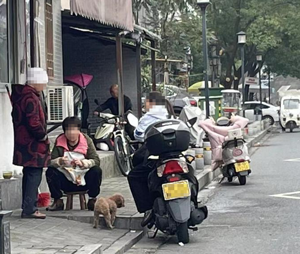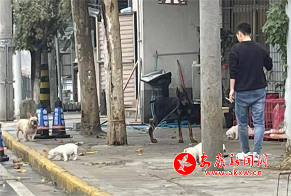11月9日,在城區東內環路住戶門前,有市民帶著狗未系繩和鄰居聊天,狗在門前隨意跑動。(圖文/馬婷)