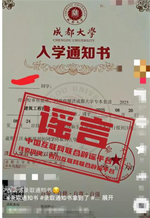 詳情:近日,有考生在網絡社交平臺發帖稱,未在高考志愿中填報“成都大學”,卻收到了所謂該校的“專本套讀入學通知書”,引起關注。8月19日,成都大學發布嚴正聲明稱:從未開展“專本套讀”形式的學歷教育招生,任何以“專本套讀”“自考全日制本科”等名義發放的所謂“入學通知書”均系偽造,其所宣稱的“入學后可調劑專業”與成都大學招生政策完全不符。