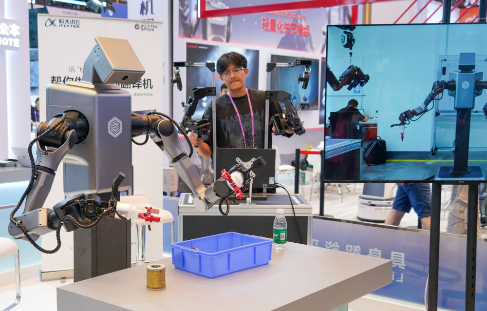 2025年10月16日,工作人員在第138屆廣交會科大訊飛展臺操作機器人拿取物品。新華社記者 肖恩楠 攝
