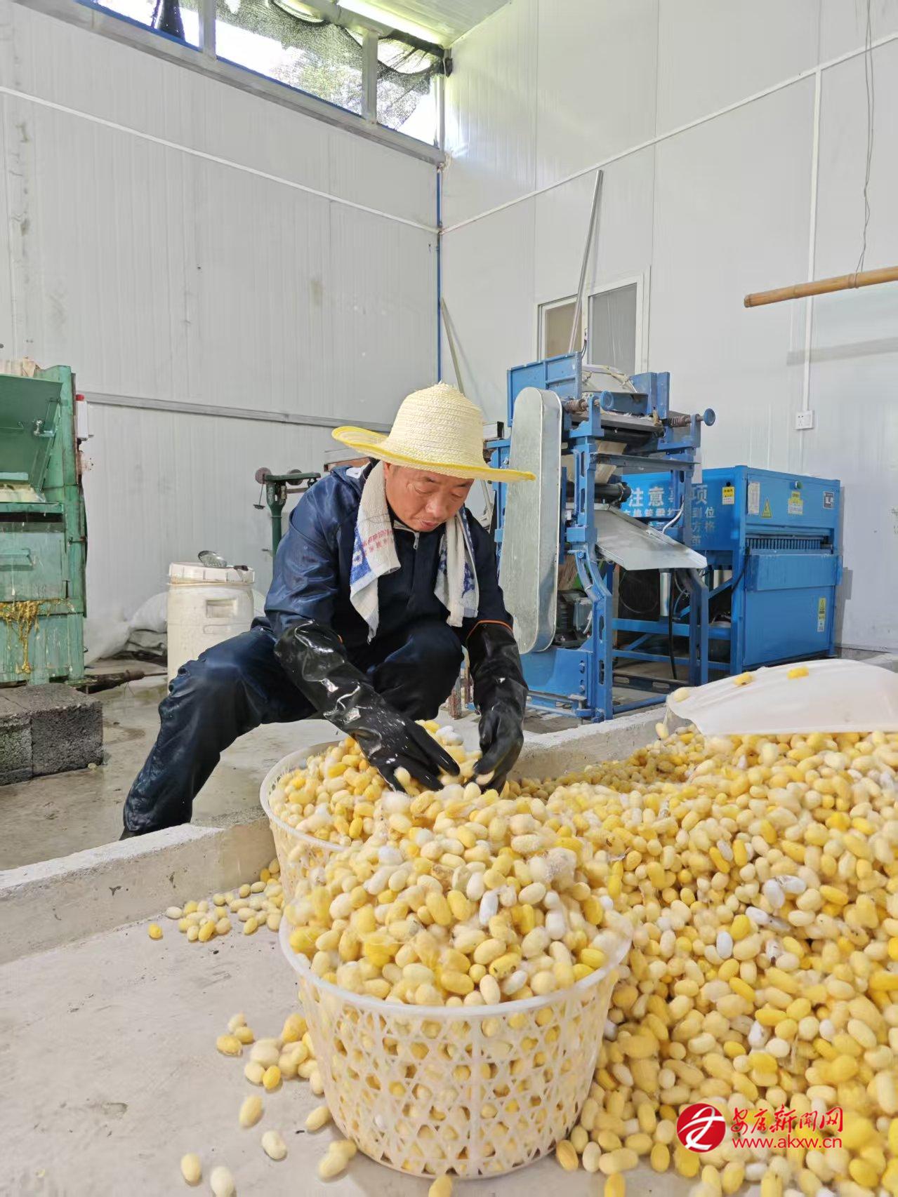 “以前養(yǎng)蠶全靠經(jīng)驗(yàn),溫濕度把控不好,蠶繭產(chǎn)量低。現(xiàn)在有了智能設(shè)備和技術(shù)指導(dǎo),養(yǎng)蠶更輕松,收入也更高了。”李家河村養(yǎng)蠶大戶王興義感慨道。作為產(chǎn)業(yè)帶頭人,他投資200余萬(wàn)元成立家庭農(nóng)場(chǎng),配套建設(shè)標(biāo)準(zhǔn)化養(yǎng)蠶室和加工廠房,引進(jìn)滑輪升降式省力化蠶臺(tái)、自動(dòng)化養(yǎng)蠶設(shè)備,實(shí)現(xiàn)了從種養(yǎng)到加工的全鏈條升級(jí)。