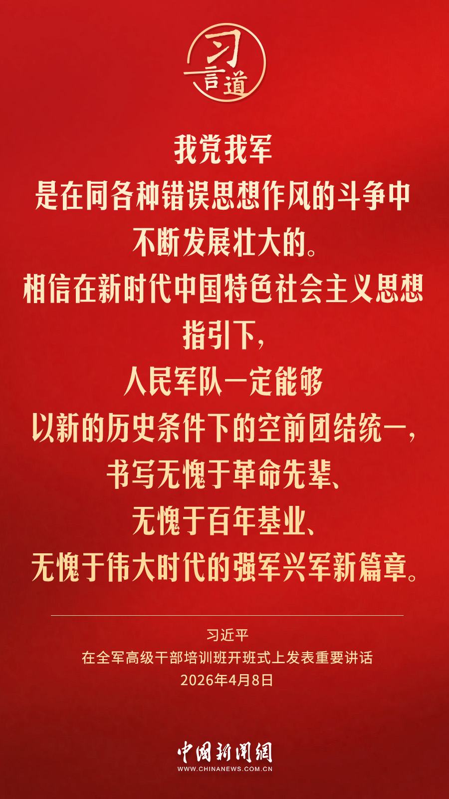 全軍高級干部培訓班8日在國防大學開班。中共中央總書記、國家主席、中央軍委主席習近平出席開班式并發表重要講話。他強調——