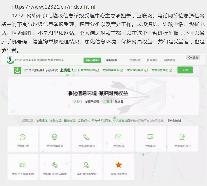 12321網(wǎng)絡(luò)不良與垃圾信息舉報受理中心主要承擔(dān)關(guān)于互聯(lián)網(wǎng)、電話網(wǎng)等信息通信網(wǎng)絡(luò)中的不良與垃圾信息舉報受理、調(diào)查分析以及查處工作。垃圾短信、詐騙電話、騷擾電話、垃圾郵件、不良APP和網(wǎng)站、個人信息泄露等都可以在這個平臺進(jìn)行舉報,還可以通過手機(jī)號碼一鍵查詢舉報處理結(jié)果。凈化信息環(huán)境,保護(hù)網(wǎng)民權(quán)益,我們是受益者,也是參與者。