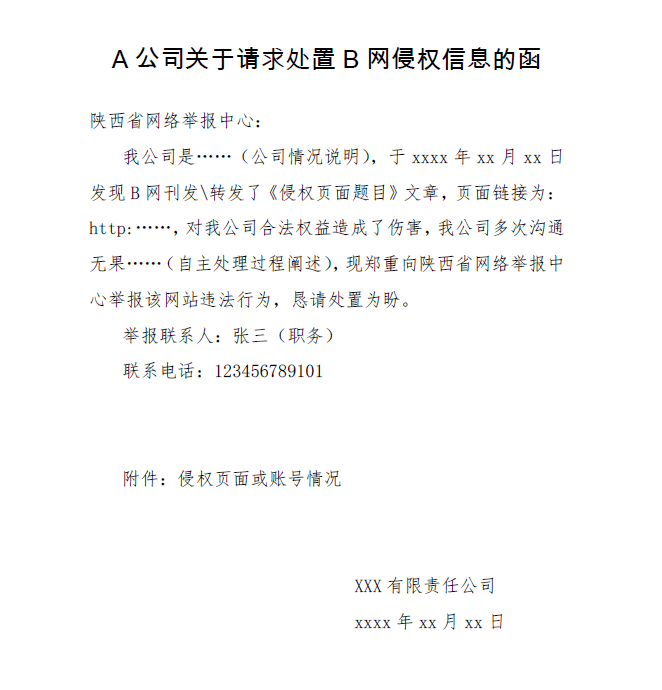 標題二號宋體居中,與正文空一格,正文三號仿宋,需闡述清楚舉報人\單位情況,舉報事由,自主處理過程,舉報訴求,聯系人及聯系方式,落款加蓋單位公章或本人簽字。格式為PDF件(如無法提供,可拍攝高清照片發送原圖)或直接傳真至029-63907152。